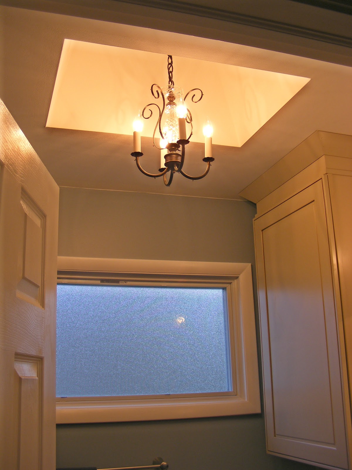 THE HOMEOWNER HAD A CHANDELIER LIGHT FIXTURE, BUT THE CEILING HEIGHT WAS TOO LOW. WE CUT A OPENING TO RAISE PART OF THE CEILING AND RE-DRYWALLED THE AREA. CHANGED THE OLD WINDOW TO A PELLA AWNING STYLE WINDOW WITH OBSCURED GLASS.
